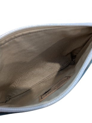 4 front panel design. Zipped opening to main compartment. Tan lining and makers label. Loop carry strap.