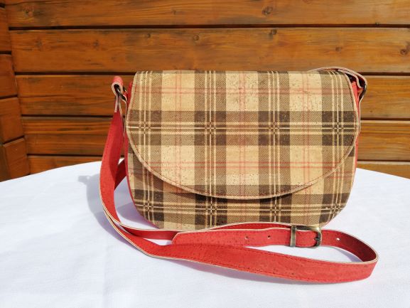 Vegan Leather Saddlebag in quality cork leather Red and Burberrish print. The bag can be worn on the shoulder or across the body. The ultimate light weight handbag handmade from Portuguese Cork Leather.